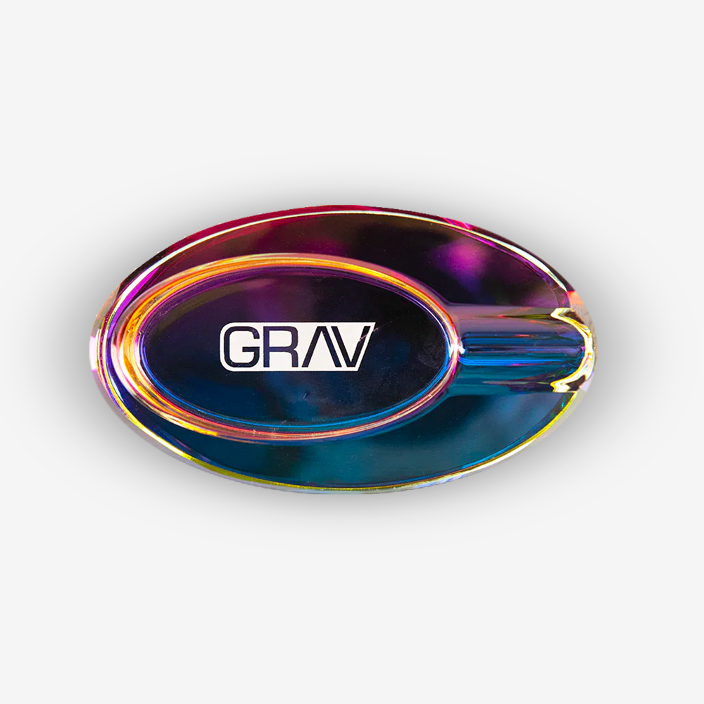 De lado, este cenicero de diseño parece claro. Pero de arriba hacia abajo, el respaldo del espejo crea un efecto iridiscente de azules, rosas, morados y amarillos brillantes.