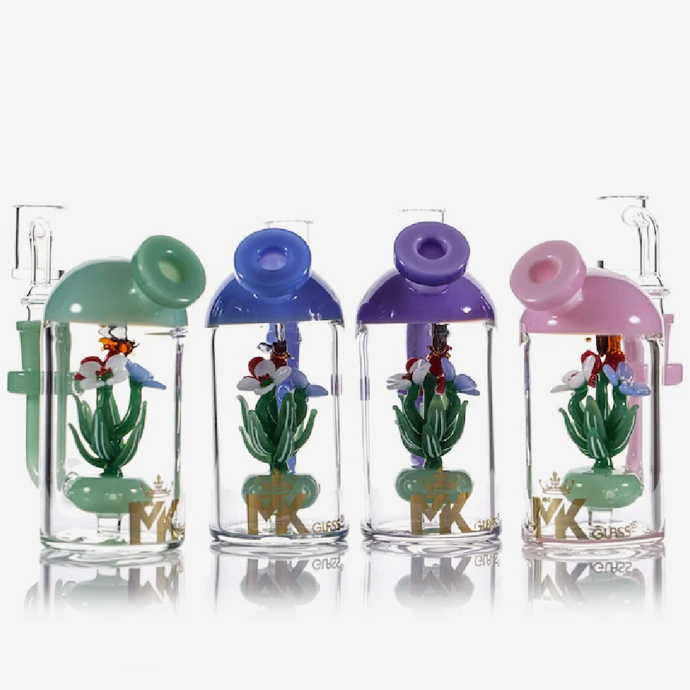 Dale un golpe a esta pipa de agua premium para dab rig MK100 BEE GARDEN está soplada a mano con vidrio de borosilicato y cuenta con un banger de cuarzo. Este equipo para dab es una obra de arte con flores, plantas y abejas de vidrio soplado dentro del equipo para dab cilíndrico en el equipo para dab con percolador tipo showerhead. Una obra de arte, es la pipa de agua ideal, con vidrio de varios colores.