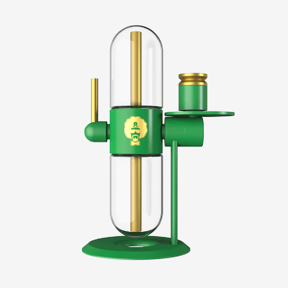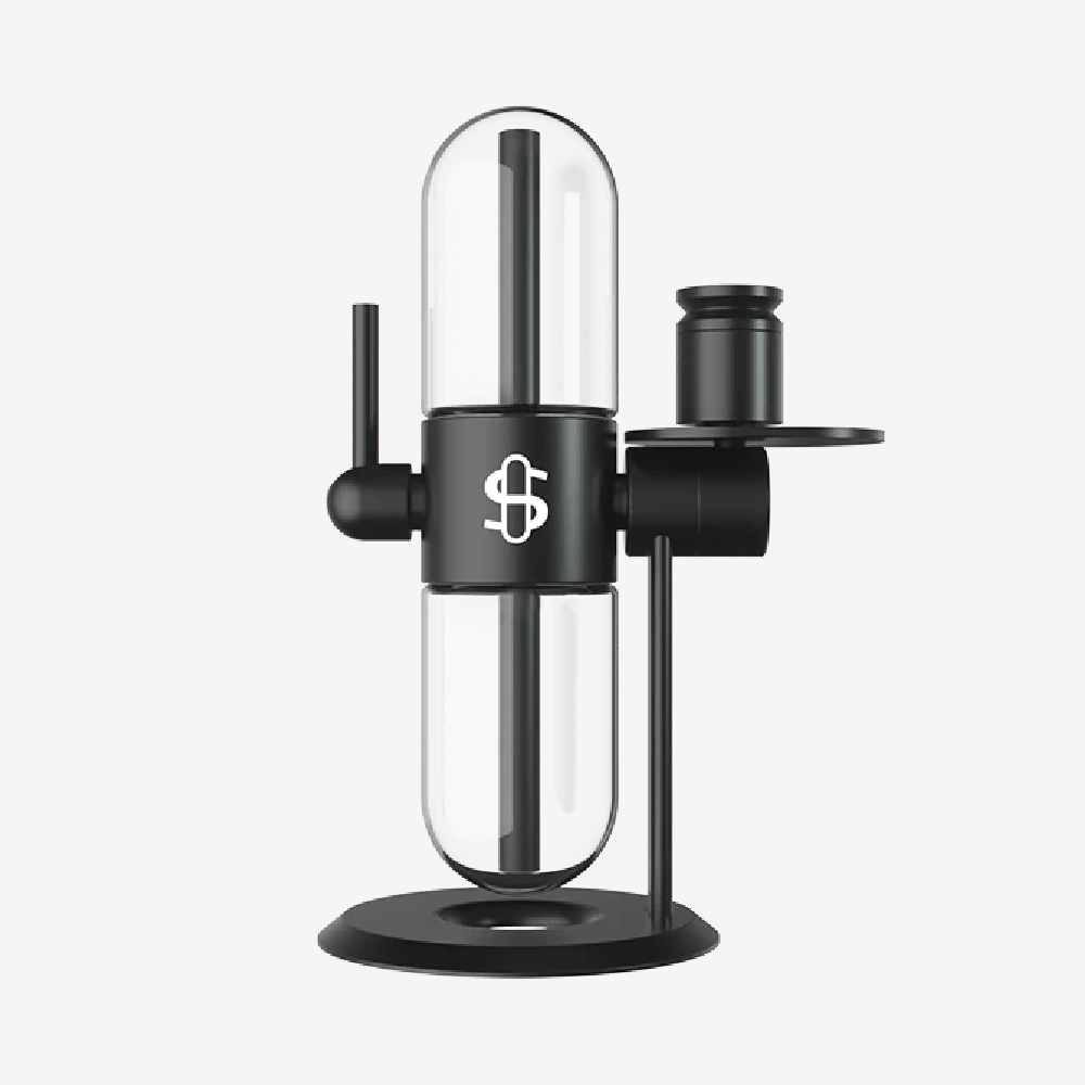 Diseñado para ofrecer versatilidad funcional, el infusor por gravedad Stündenglass es un juego completo que incluye un kit de recipiente de aluminio y un revestimiento de vidrio, pero también se puede conectar a cualquier dispositivo para fumar o vaporizar con una junta macho de 14 mm. Utilizando únicamente la física de los fluidos, se suministra un flujo constante de humo con aire forzado a través de una boquilla ajustable de 45°, lo que proporciona un consumo totalmente sin contacto.